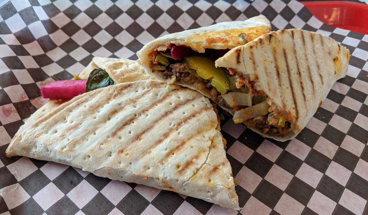 You can get your lahmajoun on its own, or you can choose from various fillings; they wrap the whole thing up and stick it in a panini press to give it a nice crispiness on its exterior.