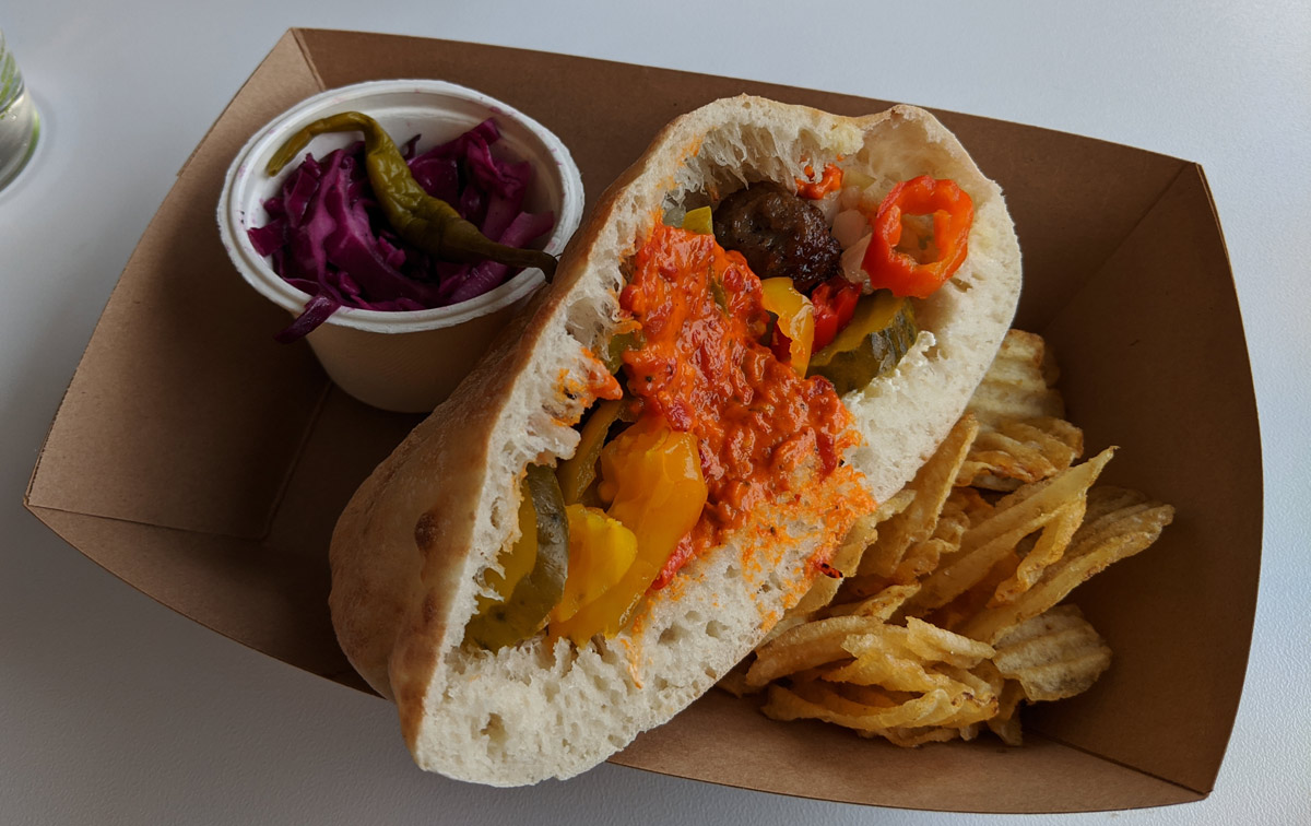 But of course, they’re not going to put that level of care and skill into the bread and then whiff it on the filling. I got the Loaded Cevapcici, which comes stuffed with cevapcici (an Eastern European sausage), kajmak (a slightly tart, ricotta-esque dairy product), avjar (a spread made from roasted red peppers), onion, pickles, and hot peppers.
