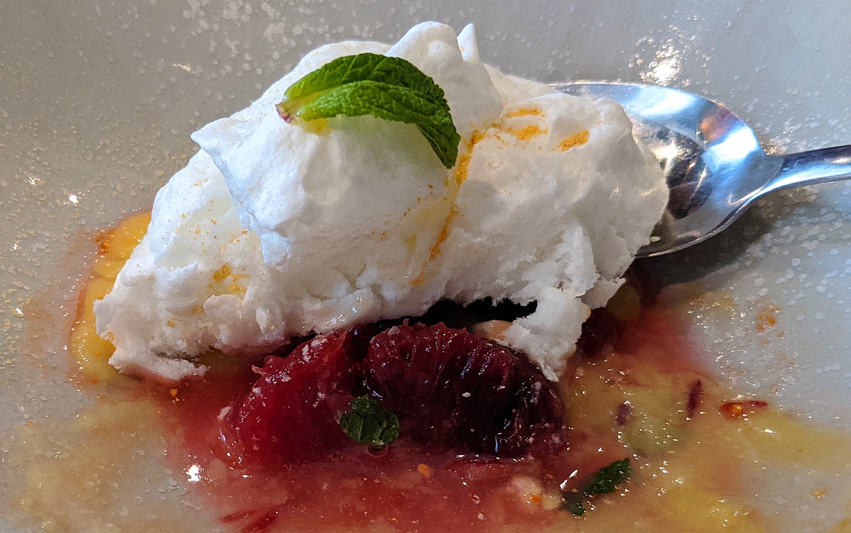 The meringue is great — it’s lightly crispy on the outside, with a soft, slightly marshmallowy interior. The fruit in this particular version is blood orange, which is sweet and slightly tart. Combined with the lemon curd, it might have been too much of a citrusy bite, but the sweet meringue balances it out perfectly. It’s delightful.